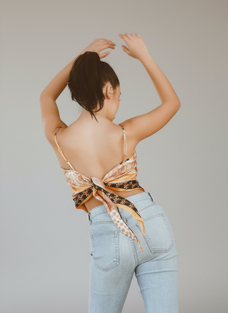 Silky satin feels luxe. Paisley print adds vintage vibes. Tie back detail keeps it flirty. Minimal coverage makes a statement. This is the top that turns heads.