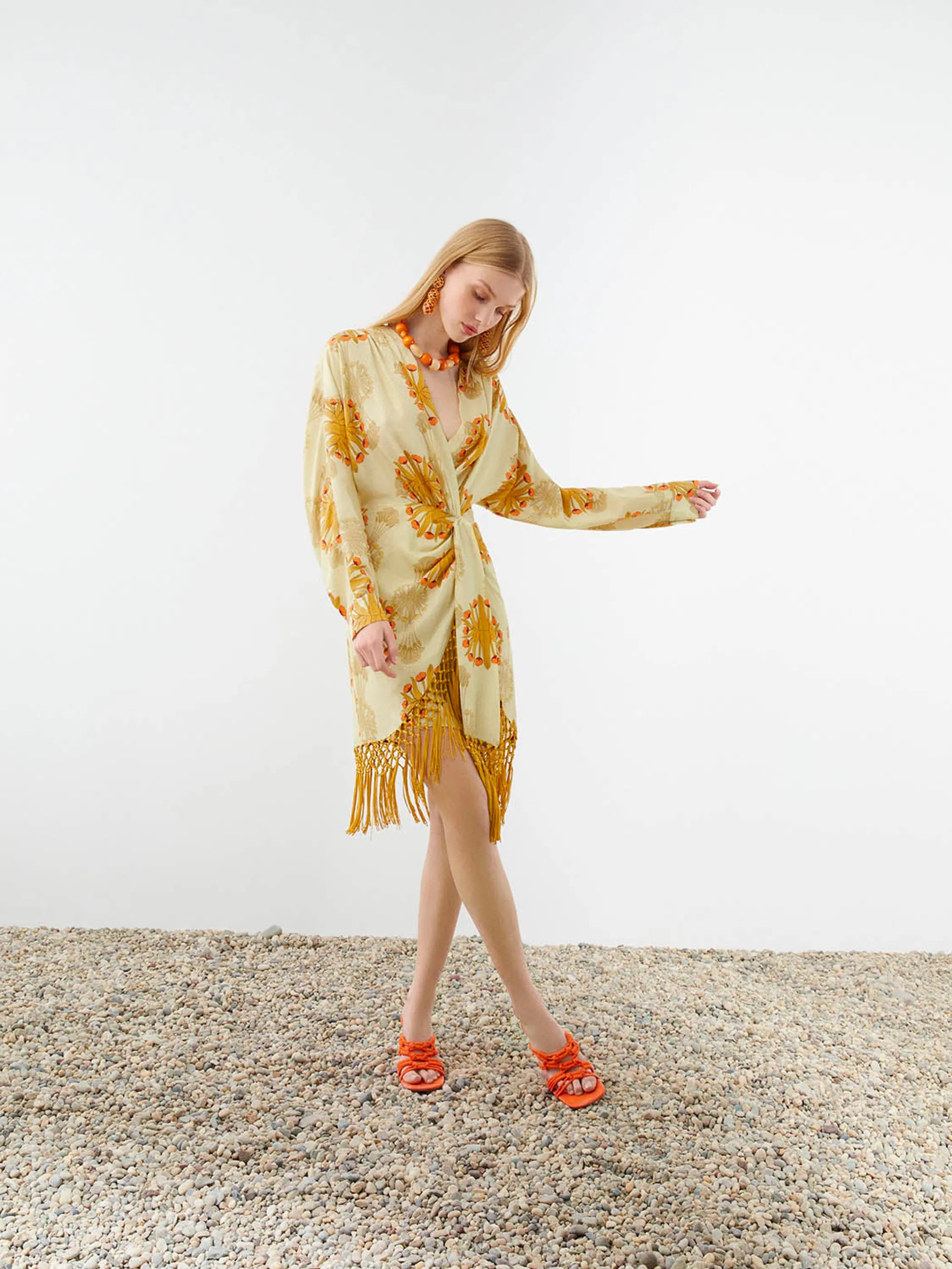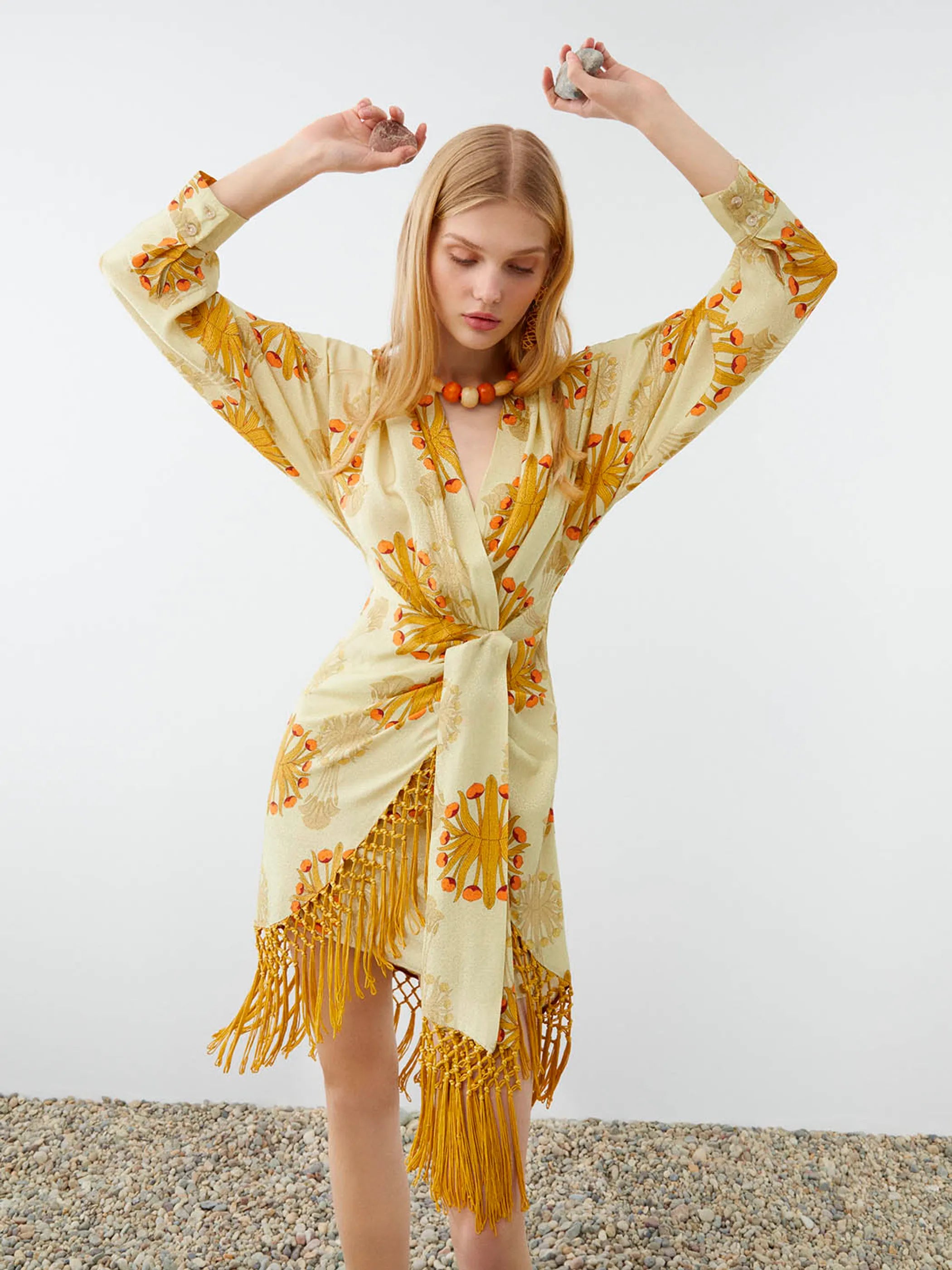 V-neck printed mini wrap dress with 3/4 batwing sleeves. Ruched shoulders and waistband. Fringe detail at self-belt and hem.