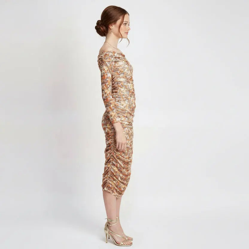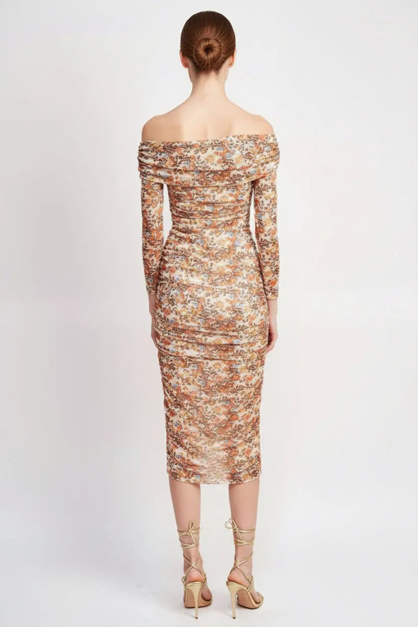 Romantic off-shoulder dress in a vibrant floral print. The flattering silhouette and feminine details make this a standout piece for warm-weather occasions and garden parties.