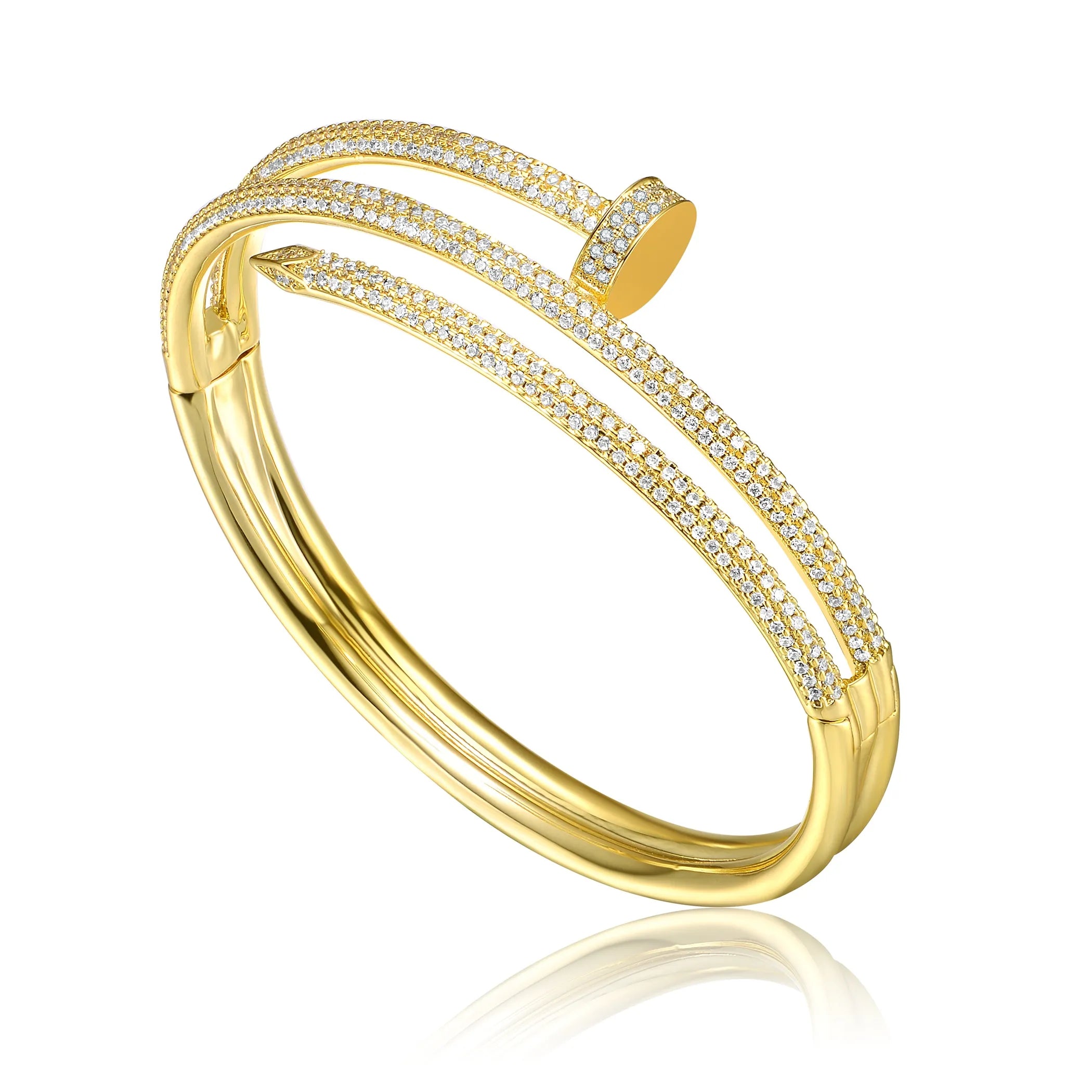 Crafted in luxurious 14K gold plating, this sculptural bangle features a sleek open design with sparkling pavé cubic zirconia stones adorning the front. The iconic nail motif creates a daring yet refined look, with one end on one side and two on the other for an asymmetric finish that's both architectural and effortlessly chic.Why You'll Love It