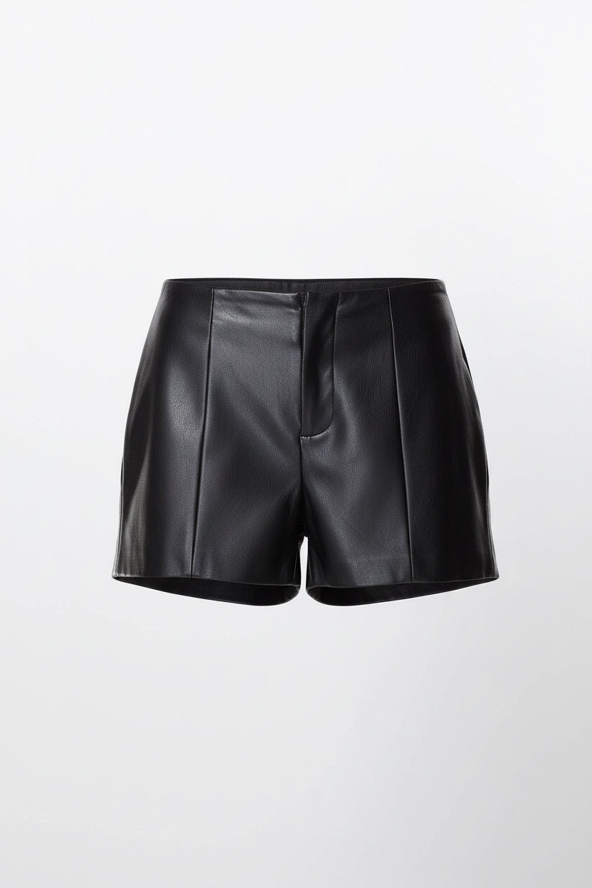 Sleek sophistication meets edgy allure in these black faux leather shorts. Crafted from premium 100% polyurethane, they deliver the luxe look of leather with all-day comfort and flexibility. The hidden side zipper creates a seamless silhouette, while functional back pockets add both style and practicality.