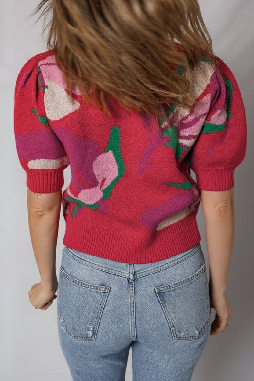 Embrace feminine charm with the Floral Abstract Short Puff Sleeve Sweater. Playful puff sleeves and a dreamy floral print meet soft knit comfort in this year-round essential.