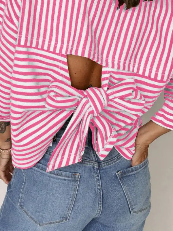 Sweet romance meets casual charm. The Cotton Pink Stripe Backless T-Shirt is effortless style perfected.