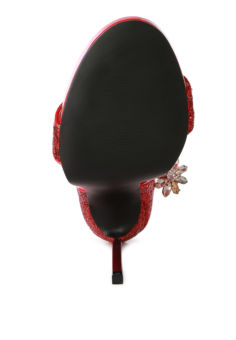 Turn heads with the Straight Fire High Heel Glitter Stilettos—where sparkle meets sophistication. These show-stopping party sandals feature dazzling glitter finish and an exquisite floral jewel brooch that catches the light with every step.