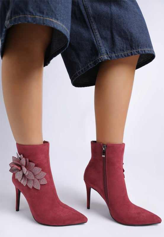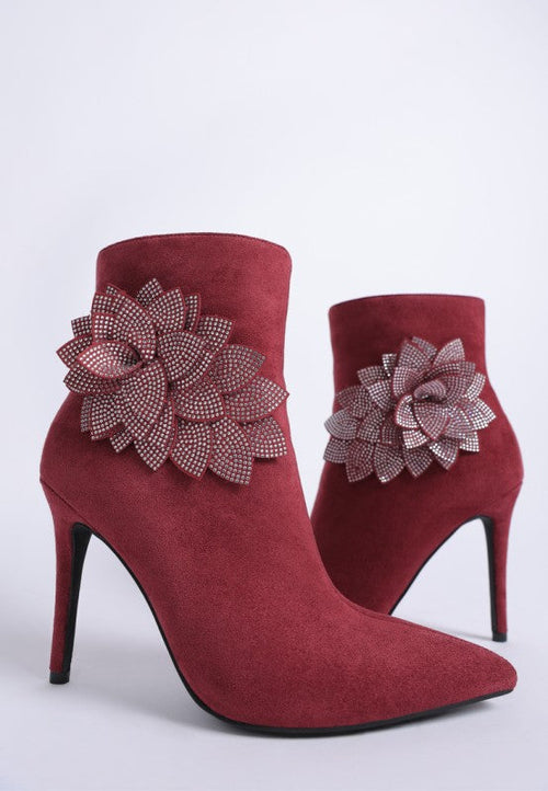Make a statement with the Yarrow Rhinestones Petal Detail Boots—where artistry meets elegance. These show-stopping boots feature exquisite rhinestone-embellished petals that catch the light with every step, transforming a classic silhouette into a work of wearable art.
