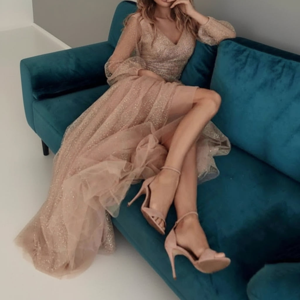 Float into the room in this ethereal champagne tulle evening gown. Sheer tulle overlay with all-over sparkle embellishments creates a dreamy, romantic silhouette. Fitted bodice flows into a voluminous floor-length skirt with luxurious movement. The soft champagne hue flatters every skin tone while the delicate sparkle catches the light beautifully.