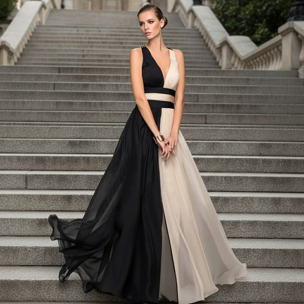 Make a dramatic entrance in this stunning two-tone evening gown. The bold color-block design features a sleek black side and elegant beige side that creates a striking visual impact. Deep plunging V-neckline and open back add modern sophistication, while the floor-length silhouette ensures timeless elegance.