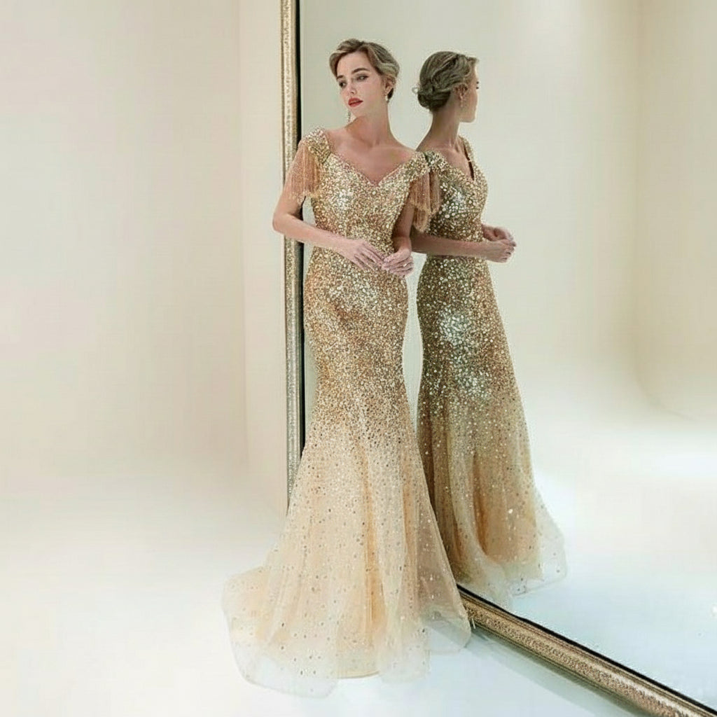 Radiate elegance in this stunning champagne ombré sequin evening gown. The shimmering gradient effect flows from soft champagne to golden tones, creating a mesmerizing visual that catches the light with every movement. Fitted bodice flows into a graceful floor-length silhouette with luxurious sequin embellishments throughout.
