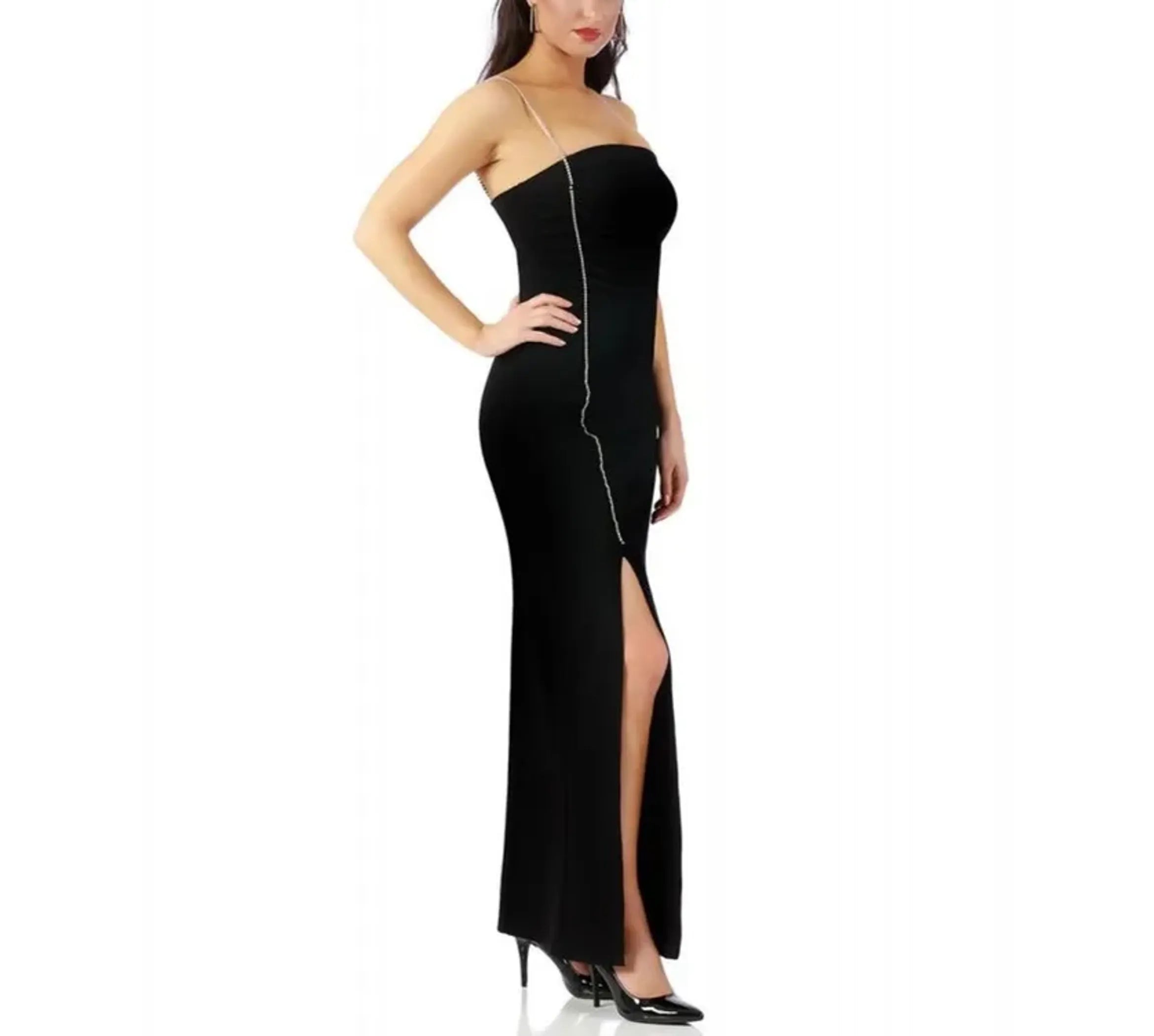 Make your grand entrance. This glamorous bandeau dress with sparkling rhinestone strap is pure red carpet energy.