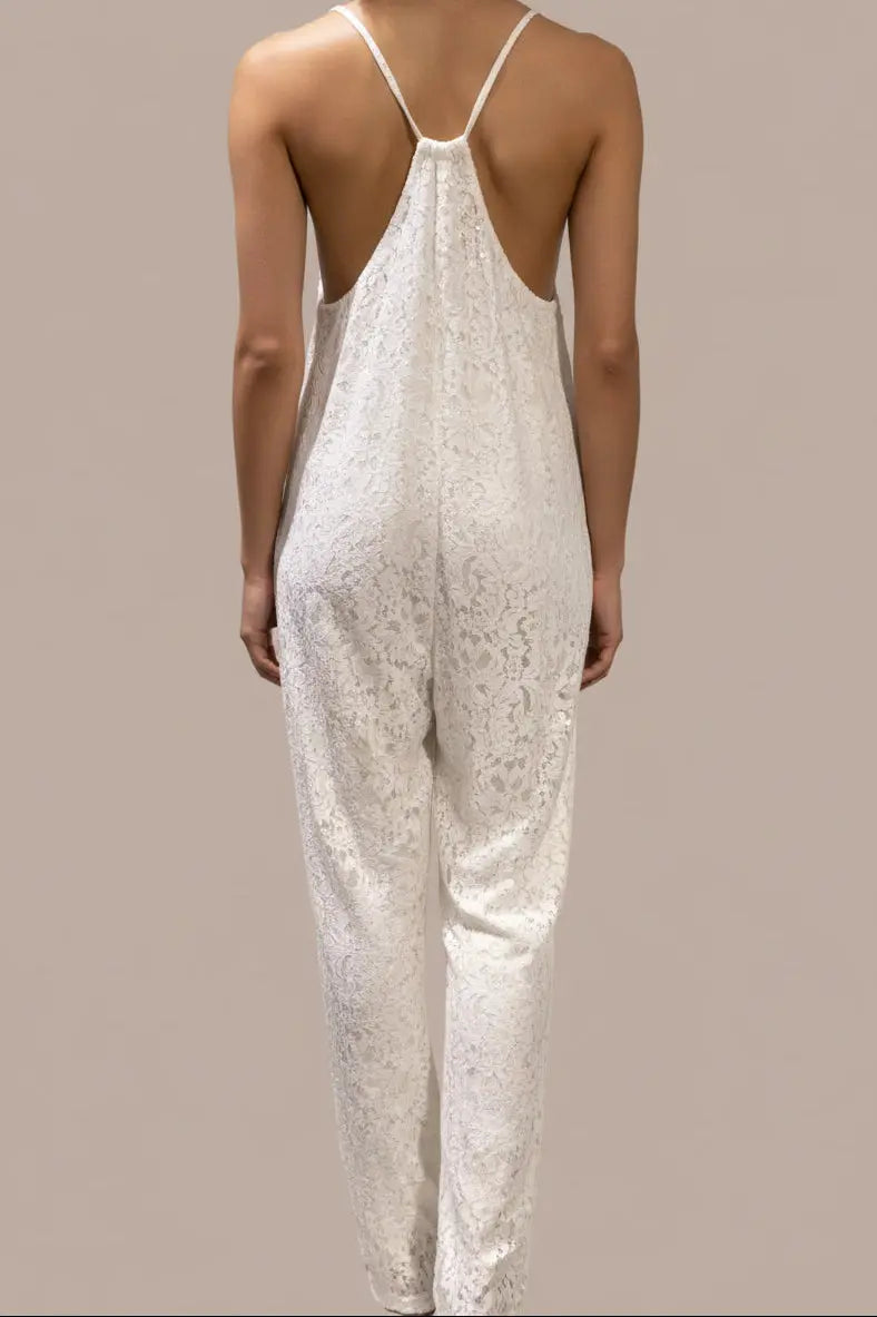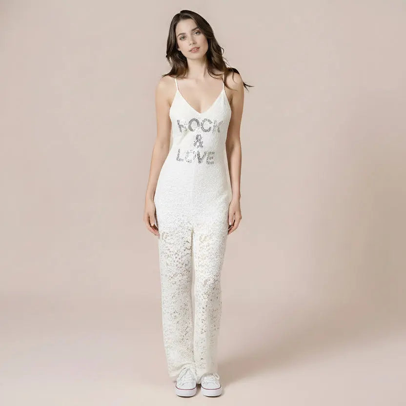 Italian elegance meets romantic allure. The 'Rock & Love' White Lace Italian Jumpsuit is vacation luxury perfected.